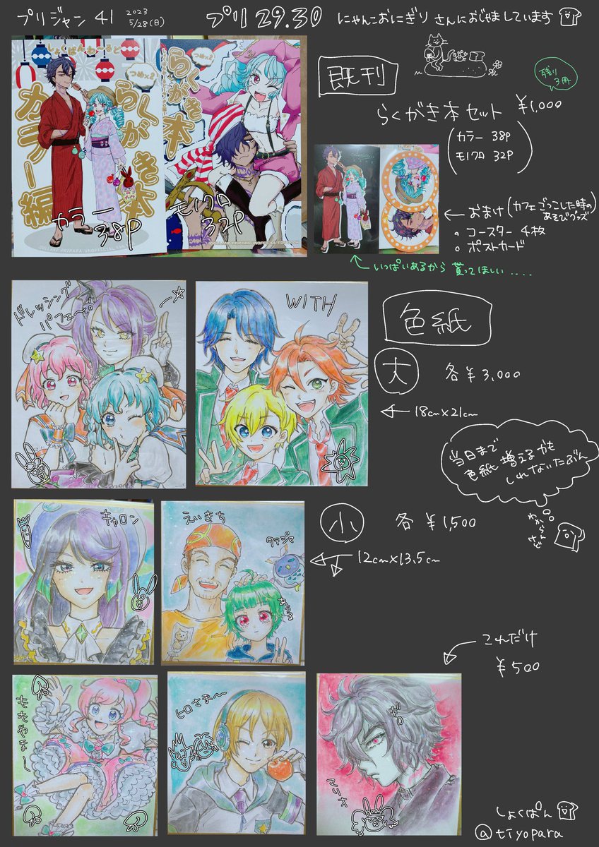 プリジャン41おしながき〜!プリ29.30のにゃんこおにぎりさんのすみっこにお邪魔させて頂きます〜! 既刊らくがき本残り3セット+色紙。 新刊なし。 お使い等で席にいない時があるよ。居る時に来てね。ごめんね。