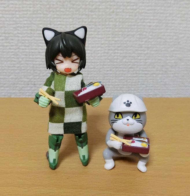 [ シルフィーは はしと べんとうを そうびした ] ということで仕事猫の箸と弁当を持てるようにしました。これでどこでも弁当を食べられるよ🍱 #デスクトップアーミー #仕事猫