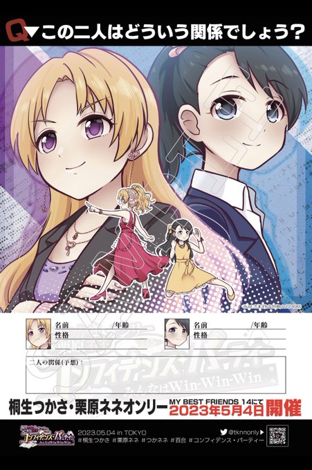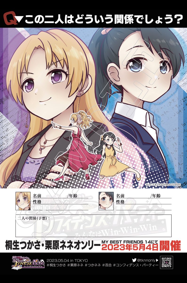 おはようございます! つかネネオンリー2023年5月4日開催! 開催告知チラシを本日開催の #C100 にて配布します! チラシの下半分に謎の大喜利コーナーもありますので、#コンフィデンス・パーティー にて是非皆さんのつかネネマルチバース妄想を開陳して頂くとつかネネオタクが喜びます。受け取ってね〜