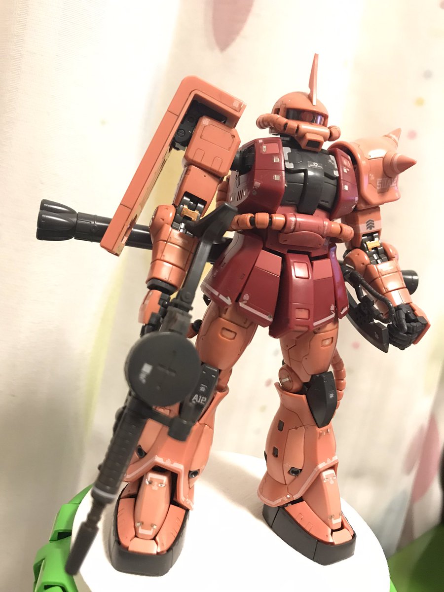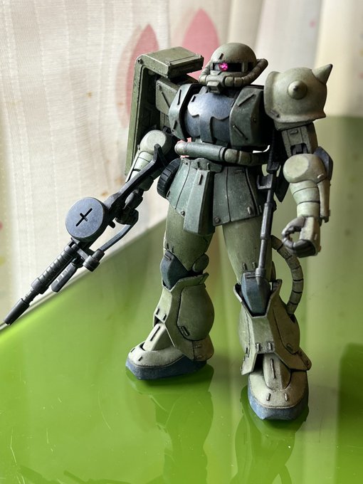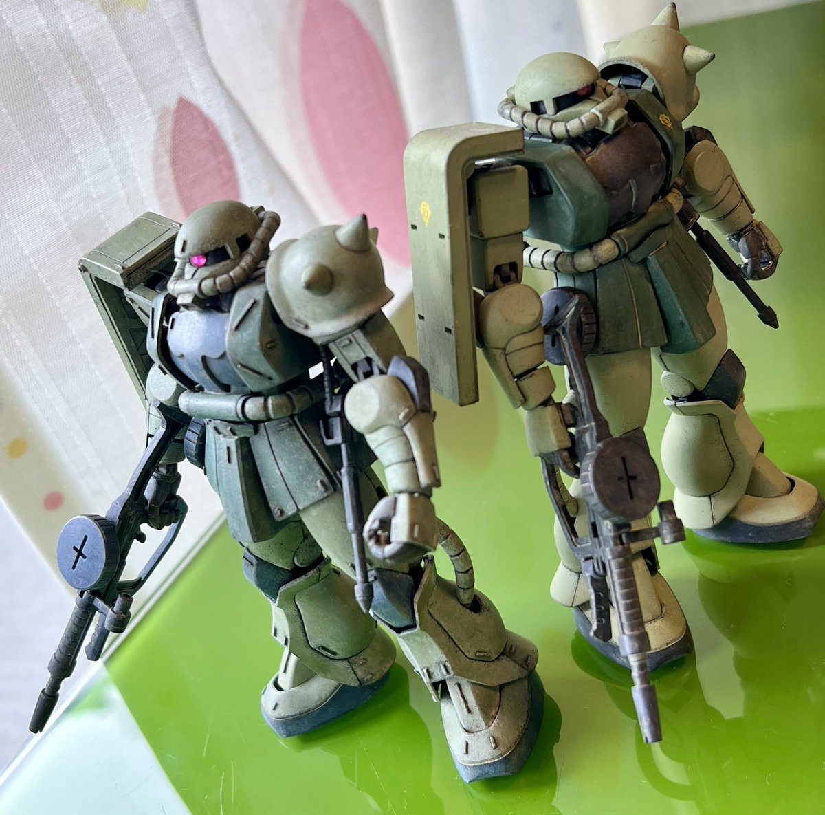 カミさんが買ってくれたザクさん、コッテリ汚しも入れ、完成としました‼︎ 2枚目はその前に組んだ、汚し控えめで薄緑が明るめのザクとの2ショット。 同じキットでも随分印象変わるもんですね〜 さて、次はパチ組みで気分転換しよっかな😜 #ザク #ガンプラ #ザクはなんぼあっても困りませんからね