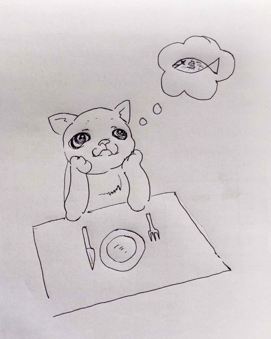 ラクガキ お魚が食べたい猫 メモ帳にボールペン #絵描きさんと繋がりたい #イラスト好きな人と繋がりたい