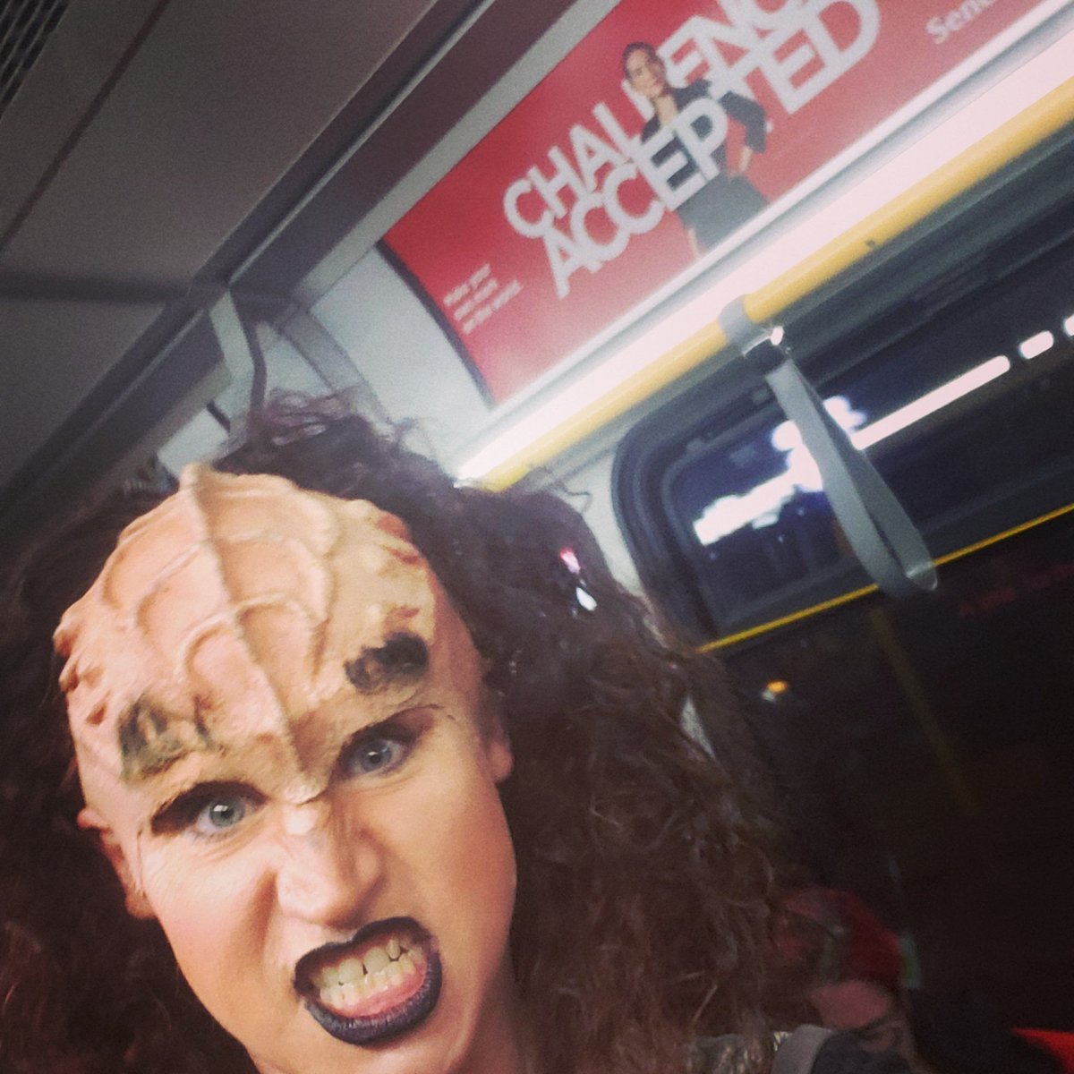 Sign on the @OfficalRBLXTTC #bus from @SenecaCollege says "Make your own mark on the world. #challengeaccepted " I think I do! #betheweird #klingon #cosplay #timminsklingons #startrek #klingonassaultgroup #everythingisbetterwithKlingons