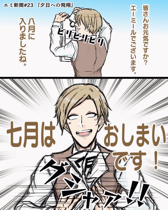 84 795 先週のem新聞冒頭挨拶の「おしまいです!」がなんとも好きだったので勢いあるバージョンで描いてみました 20/08/11 19:16