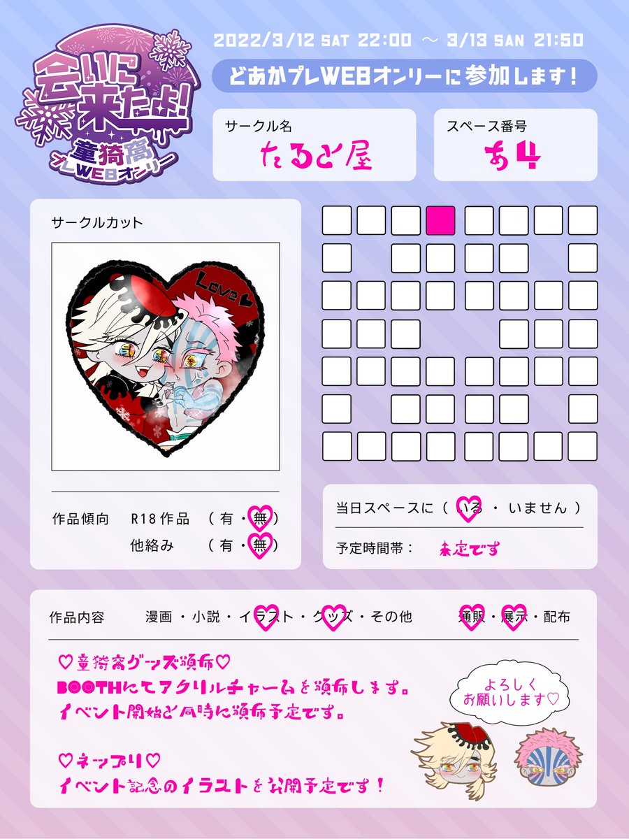 #童猗窩webオンリー こんなん出ます! ラブラブ?アクリルチャームです! でかめです! 座くんのおててカチカチです! あと展示とネップリできたらいいなとおもってます! 実物届いたらまたツイートします😊❤️ tarteya.booth.pm/items/3679987