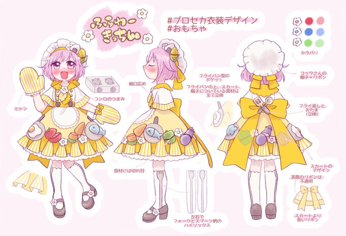 8 25 女性用デザイン 「ふらわーきっちん」 料理のおままごとセットをモチーフにわちゃわちゃ楽しいデザインにしました🥕🍳 #プロセカ衣装デザイン #おもちゃ 22/07/31 08:54