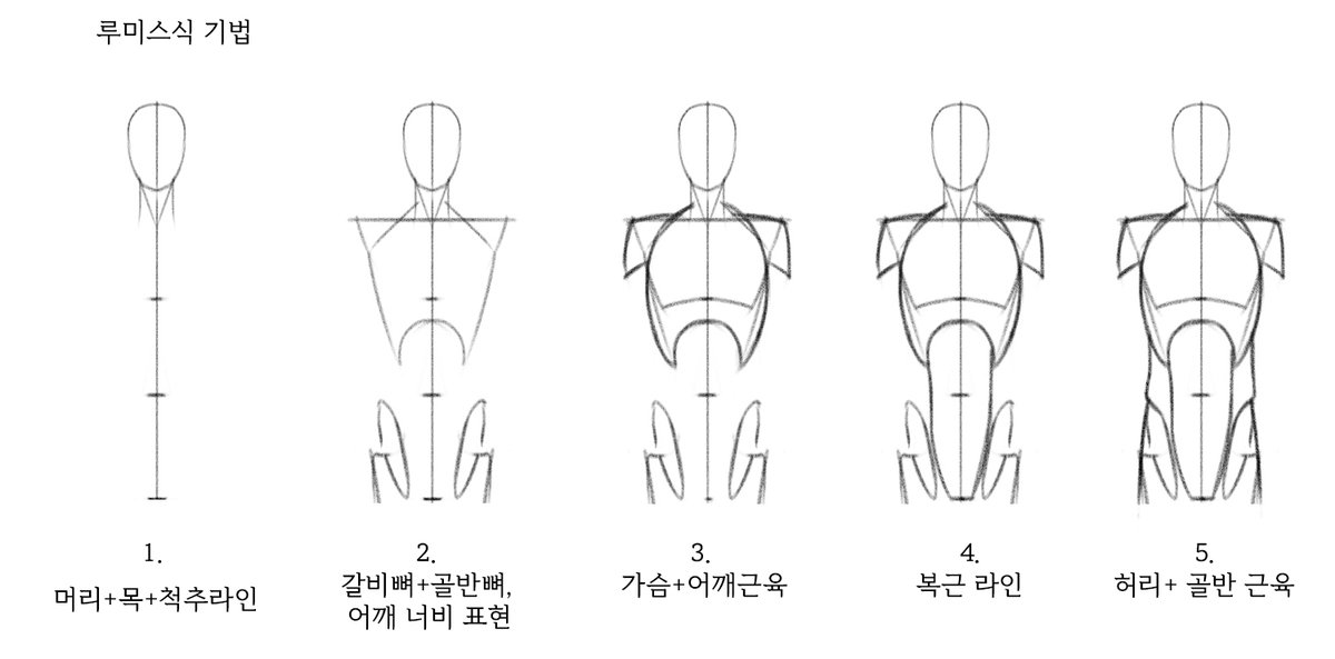 ๋ฃจ๋ฏธ์ค์ ๊ธฐ๋ฒ 1. ๋จธ๋ฆฌ ๊ธธ์ด๋ฅผ ์ด์ฉํด ๋ฑ์ ๋น์จ ์ฌ๊ธฐ: 2๋ฑ์ ์ง์ -์ ๋, 3๋ฑ์ -๋ฐฐ๊ผฝ, 4๋ฑ์ ์นธ-๊ณจ๋ฐ 2. ๊ฐ๋น๋ผ์ ๊ณจ๋ฐ๋ผ์ ์์ฃผ ๊ฐ๋ตํ ํํ๋ฅผ ๊ทธ๋ฆฝ๋๋ค. 3. ๊ฐ๋น๋ผ์ ์ด๊นจ+๊ฐ์ด๊ทผ์ก์ ๊ทธ๋ฆฝ๋๋ค. 4. ๊ณจ๋ฐ๋์ผ๋ก ๋ณต๊ทผ์ ์ฐ๊ฒฐํฉ๋๋ค. 5. ํ๋ฆฌ์ ๊ณจ๋ฐ ๊ทผ์ก์ ํํํฉ๋๋ค.