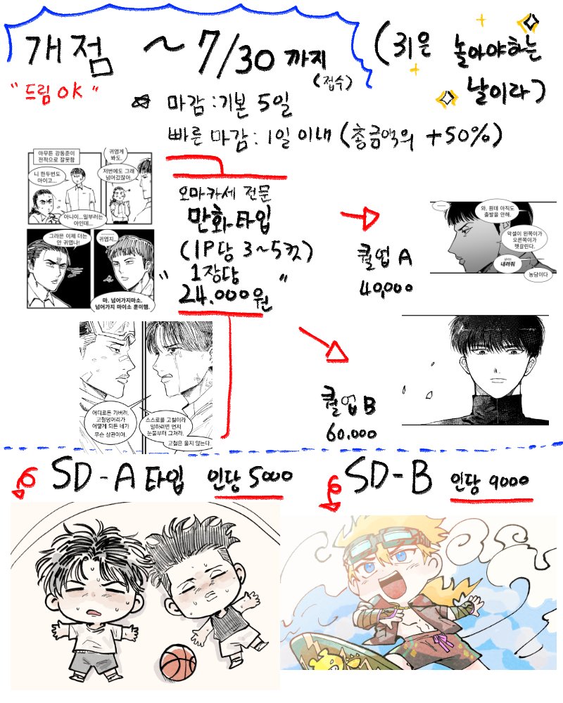 잠깐 열었었던 커미션 재개장합니다! 링크로 들어오셔서 <신청 타입, 신청 내용, 외관(+성격) 자료> 보내주시면 금방 확인하겠습니다😁 만화 타입은 스토리 없이 소재만으로 오마카세 가능합니다🥰 (8월부터는 닫아둔 기존 커미션을 개장 예정입니다~!) open.kakao.com/o/s5Q8eE3c
