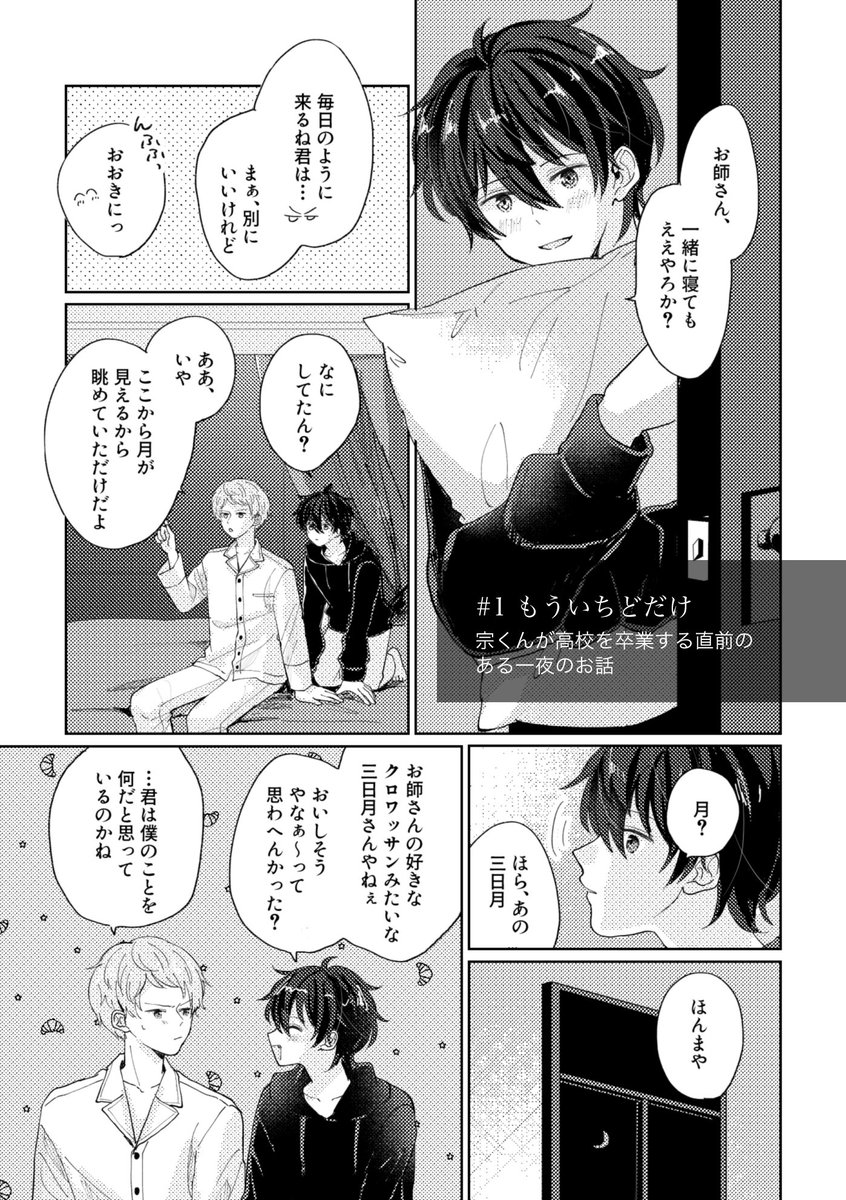 【6/25 JBFES みか宗新刊サンプル】 東5 ま35a 『きみと夢見る夜のこと』 全年齢/A5/表紙込46p/600円(予定) 添い寝がテーマの短編集です。🍬と🥐が布団の上でお喋りしたりいちゃついたりしてます。 !軸、!!軸、同棲してる未来軸の3本。 ツリー最後の部数アンケにご協力お願いします。(1/4)