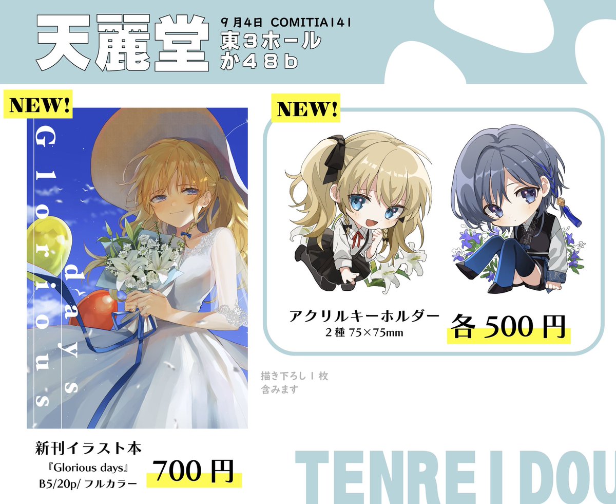 9月4日(日) 💠コミティアお品書き💠 新刊イラスト本とアクキー2種販売します! 東3ホール 【か48b】天麗堂 よろしくお願いします! #コミティア141 #COMITIA141