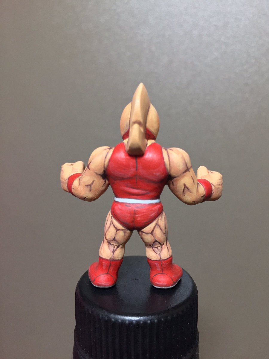 キン肉マン 完成。今までの倍ぐらいのエナメル塗料を使いました。今回は赤ver.。これは父親の仏壇に飾る為に塗りました。今度、三回忌で実家に帰る時に置いて来ます。#キン消し #キンケシ #キン肉マン
