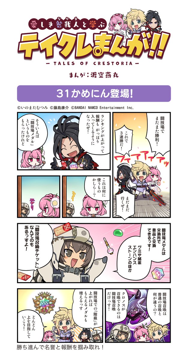\ #テイクレまんが / 31話「かめにん登場!」を更新しました! 闘技場で勝利して「闘技場メダル」をゲット! 交換所で使用すれば様々なアイテムと交換できますよ♪ バックナンバーはこちらから! crestoria.tales-ch.jp/manga 次回は5/25更新です! #テイクレ