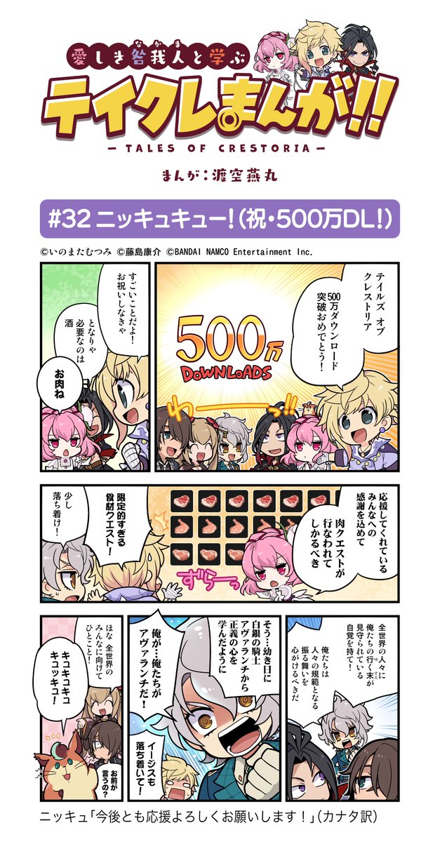 \ #テイクレまんが / 32話「ニッキュキュー!(祝・500万DL!)」を更新しました! テイクレは500万DLを突破!いつも温かい応援をありがとうございます! 今後もカナタ達をよろしくお願いします♪ バックナンバーはこちら! crestoria.tales-ch.jp/manga 次回は6/8更新です! #テイクレ