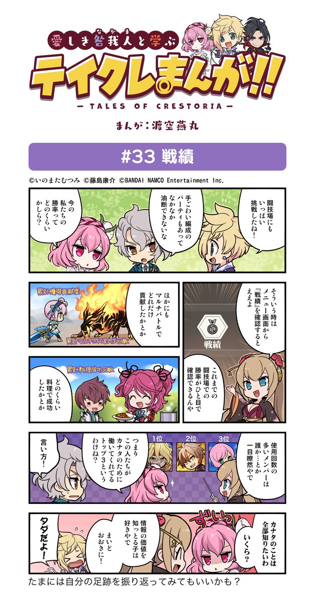 \ #テイクレまんが / 33話「戦績」を更新しました! ゲームでの自分の足跡が気になったら「戦績」を確認しましょう! 闘技場での勝率や使用回数の多いメンバーなど見ることができますよ♪ バックナンバーはこちらから! crestoria.tales-ch.jp/manga 次回は6/22更新です! #テイクレ