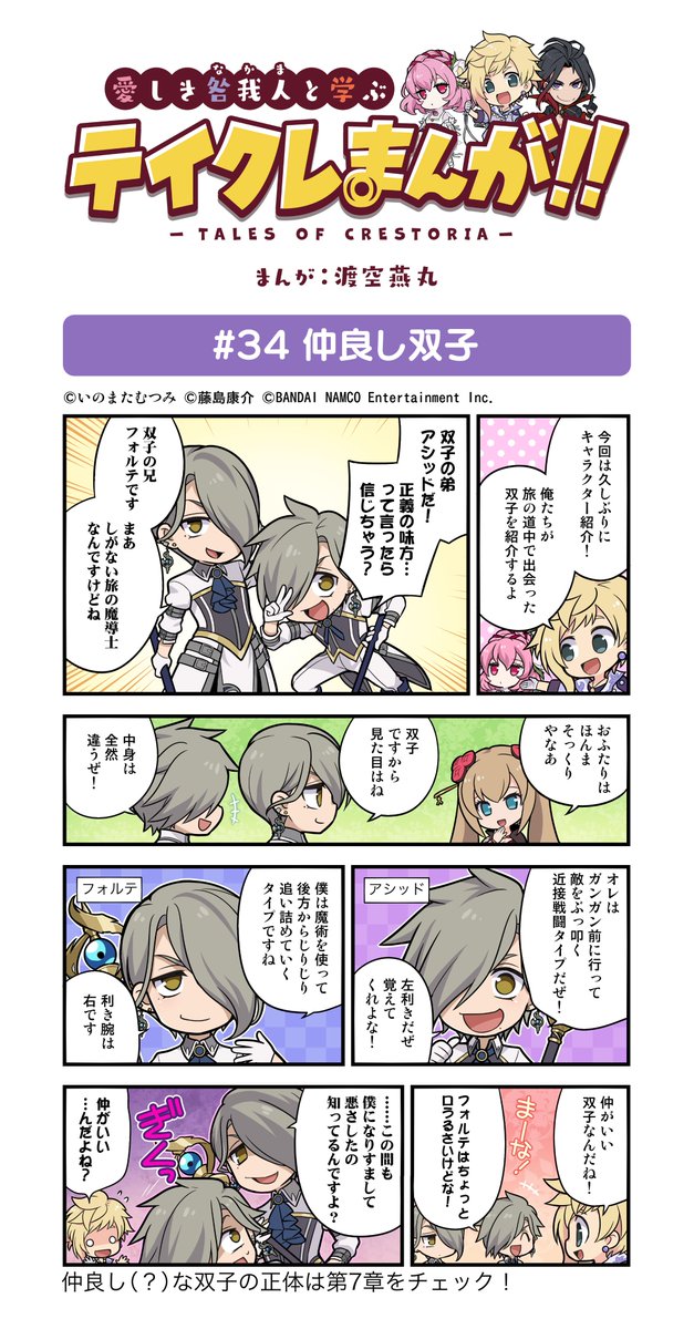 \ #テイクレまんが / 34話「仲良し双子」を更新しました! 今回は双子の「アシッド」と「フォルテ」が登場! 二人のことをもっと知りたい方はメインストーリー第7章をチェック♪ バックナンバーはこちらから! crestoria.tales-ch.jp/manga 次回は7/6更新です! #テイクレ