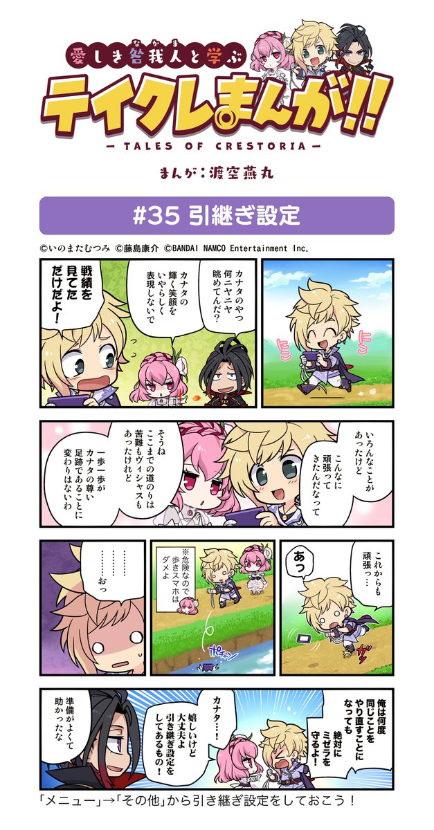 \ #テイクレまんが / 35話「引継ぎ設定」を更新しました! いざという時でもデータ引継ぎ設定をしておけば安心! 「メニュー」→「その他」から設定しましょう♪ バックナンバーはこちらから! crestoria.tales-ch.jp/manga 次回は7/20更新です! #テイクレ