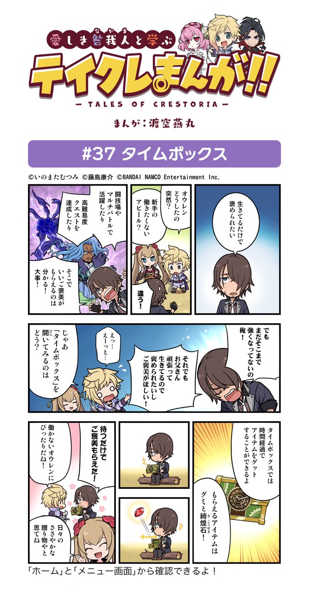 \ #テイクレまんが / 37話「タイムボックス」を更新しました! 時間経過で便利なアイテムが獲得できるタイムボックスは、「ホーム」または「メニュー画面」から確認することができます♪ バックナンバーはこちらから! crestoria.tales-ch.jp/manga 次回は8/17更新です! #テイクレ