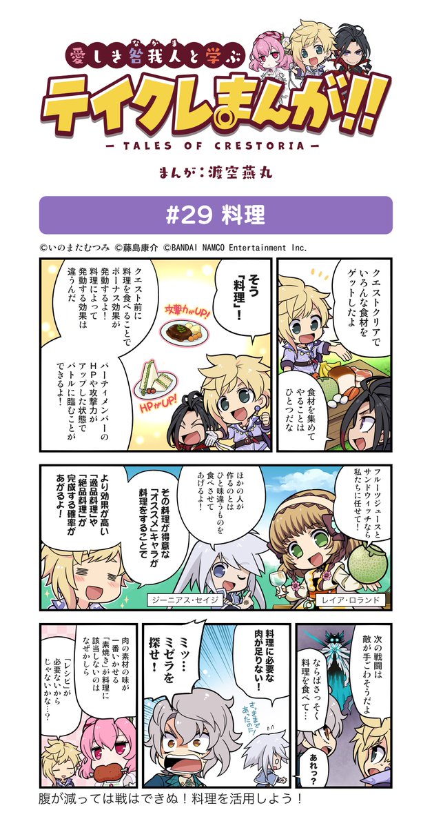 \ #テイクレまんが / 29話「料理」を更新しました! クエストクリアで得られる食材で料理を作りましょう! 食べることで様々なボーナス効果が発動します♪ バックナンバーはこちらから! crestoria.tales-ch.jp/manga 次回は4/27更新です! #テイクレ