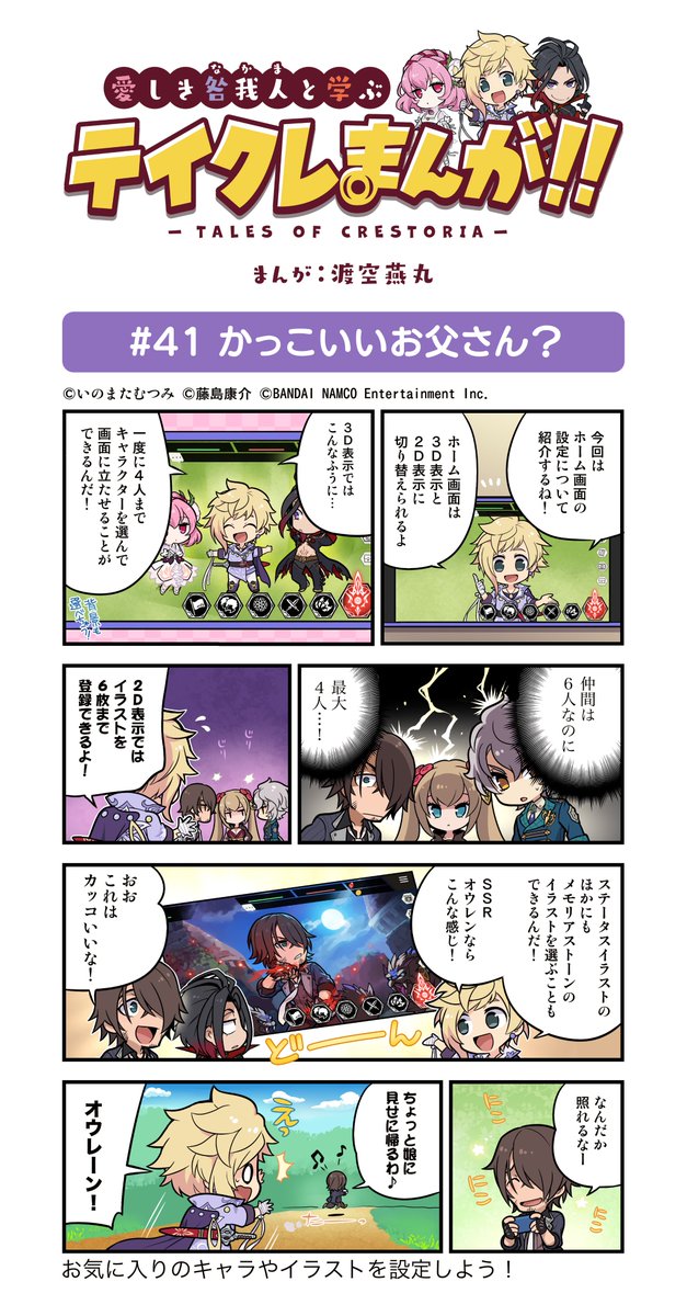 \ #テイクレまんが / 41話「かっこいいお父さん?」を更新しました! ホーム画面では3D表示と2D表示に切り替えることができます! お気に入りの仲間たちを設定しましょう♪ バックナンバーはこちらから! crestoria.tales-ch.jp/manga 次回は10/12更新です! #テイクレ