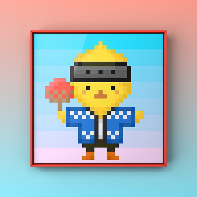 #LovelyPixelNinjas の新作です💕 法被(はっぴ)姿の 雛之丞(ひなのじょう)くん🐥 うちわを持っています 🔸近日発売 🔸0.006ETH(polygon)予定 🔸特典NFTあります🎁 OpenSea(polygon)が不安定で mint(NFT化)がまだなんです😂 よろしくお願いします🎀 #CryptoNinja #ninjart #ドット絵