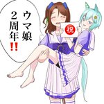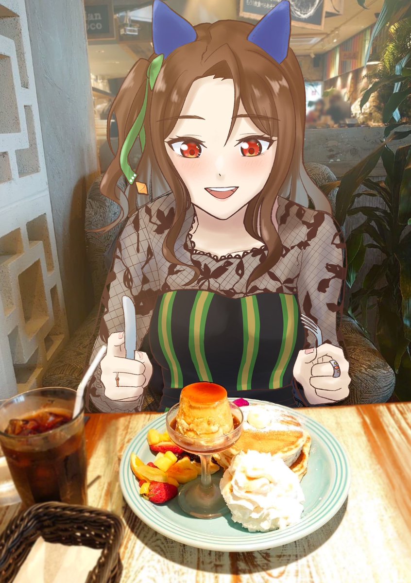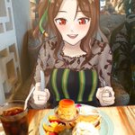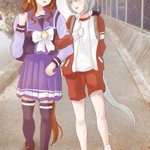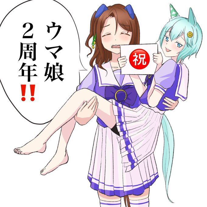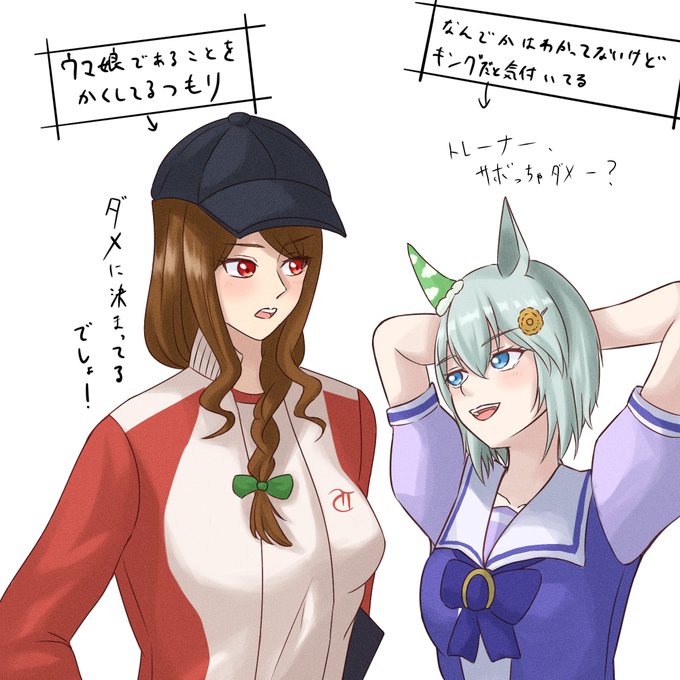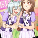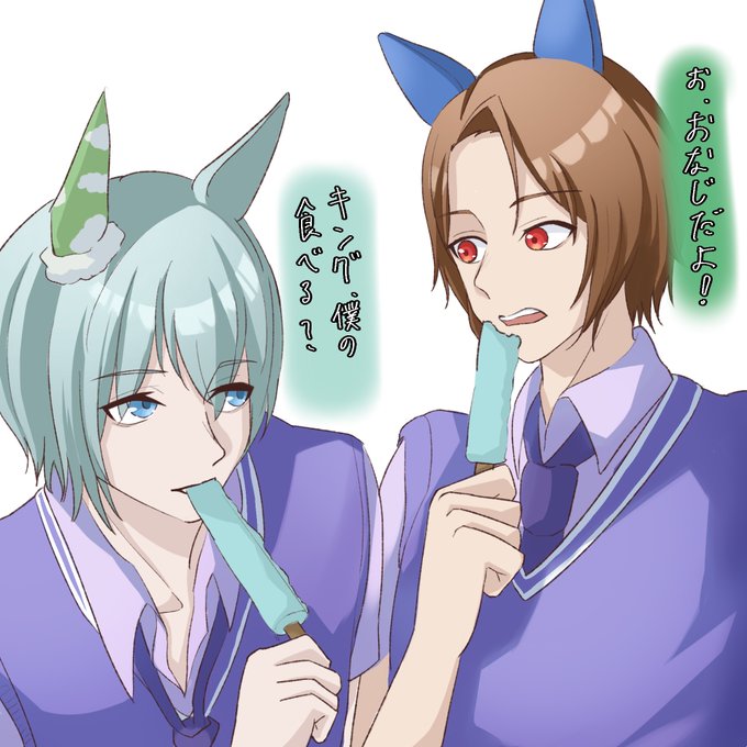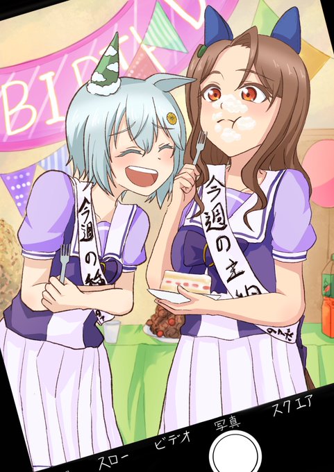 #キングヘイロー生誕祭2023 #セイウンスカイ生誕祭2023 「はい、キング、あーん」 「って!これ入り切らないサイズじゃ……モゴモゴ……」 「あははは!おめでとう、キング」 「あなたもね、スカイさん」 改めて2人ともおめでとう〜!!!!! #ウマ娘