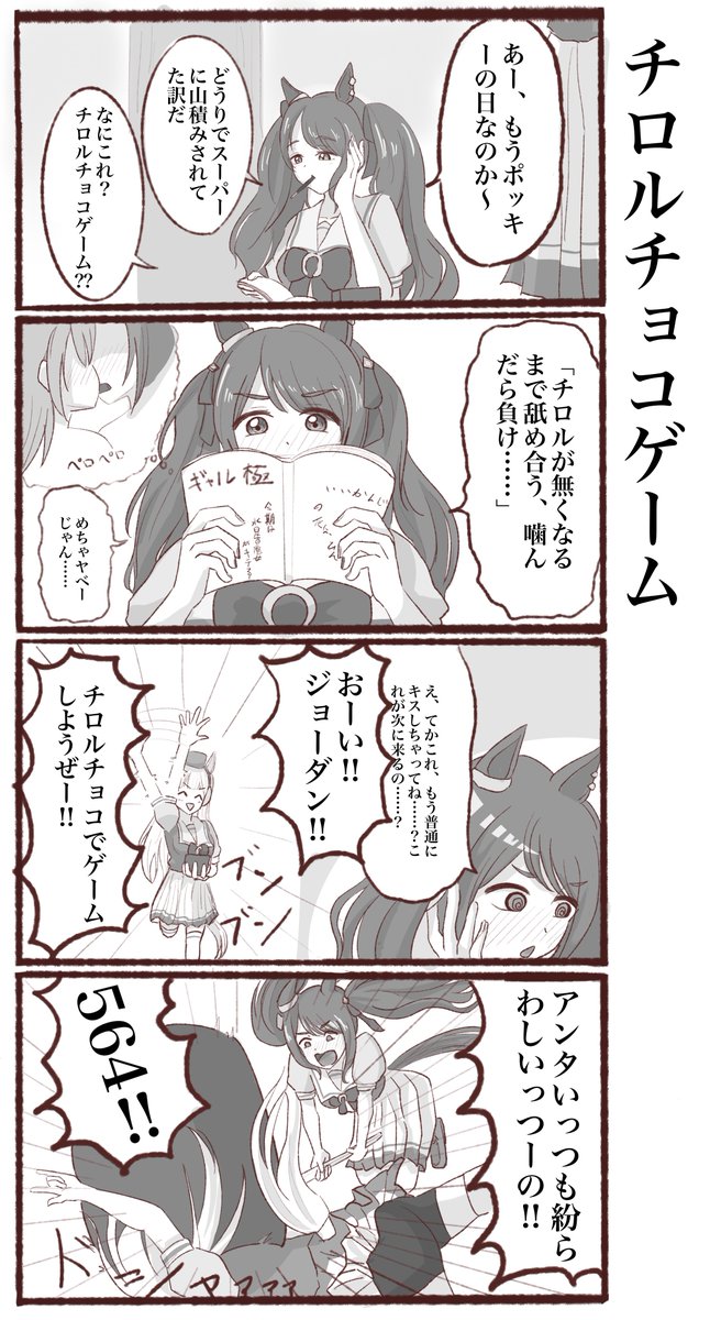 \大 大 大 遅 刻/ 私用でこんなに遅れましたが、人生初の4コマです。 チロルチョコゲーム、勝手に昔流行ってたと思ってたら艦これ絵師様の発案ネタを昔に見ただけでした() ジョーダンほんとに可愛い……好き…… #ウマ娘 #トーセンジョーダン #ゴールドシップ