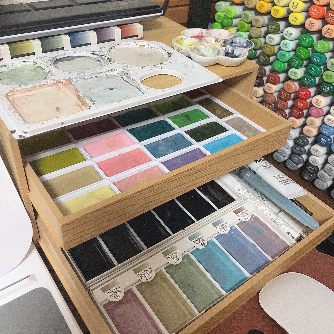 アナログな上に面倒くさがりの私は作業机がどうしても散らかってしまう! 画材を出したり片付けたりのひと手間さえめんどくさいなと思った結果引き出しその物をパレットにしちゃえと思いついて実行。 これでわざわざ画材出さなくてもこのまま色とって色塗れるし片付ける手間もない笑(伝われ)