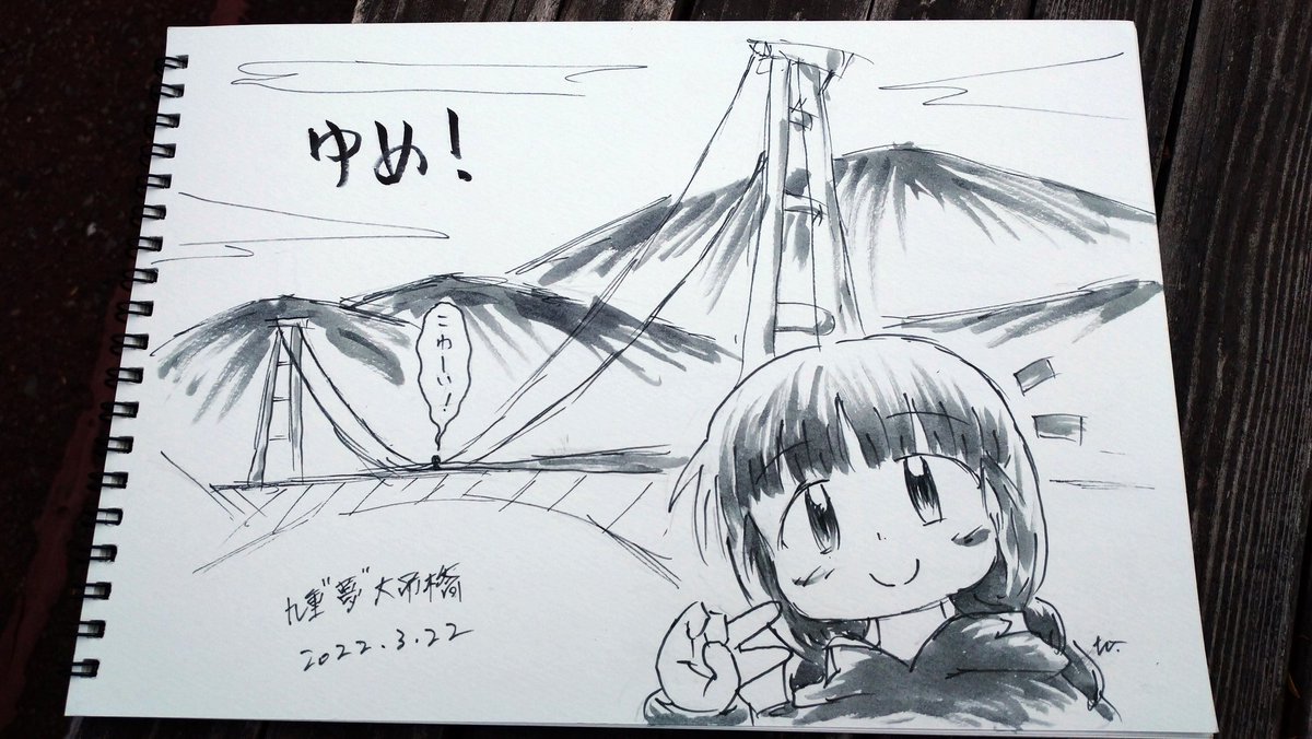 2 25 つーことで描きました! グルグル絵描いたの2年ぶりだよ!わざわざペンと色鉛筆用意したよ! …お絵描き再開しようと思ってもなかなかきっかけがなかったんだけど、途中から今回の巡礼を復活日にしようと決めていました。 #魔法陣グルグル #九重夢大吊橋 22/03/22 14:55