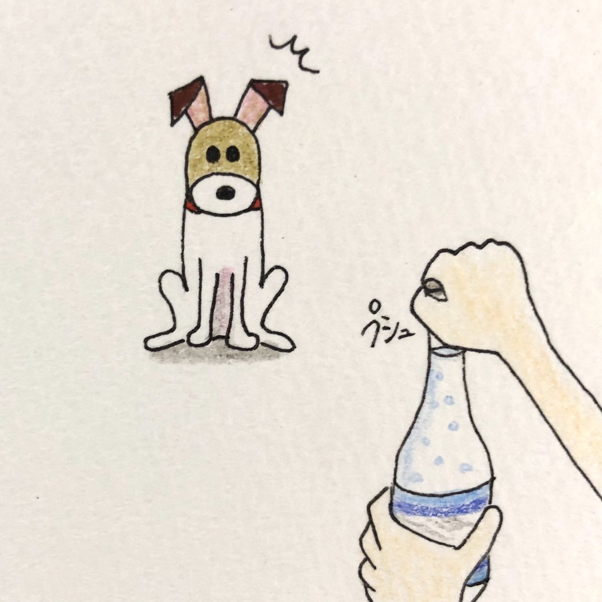 炭酸水のペットボトルを開ける時の「プシュッ」の音に毎回ビックリしちゃうトト🐶😅 何か発射したと思っちゃうのかな?🚀😂 毎回ビックリしちゃうので、「炭酸水開けるね。」とトトに言ってから開けるようにしました😁🐶 それでもビックリしちゃうけど😅 #ジャックラッセルテリア #イラスト #犬