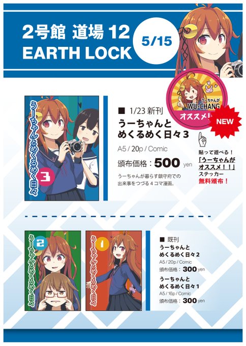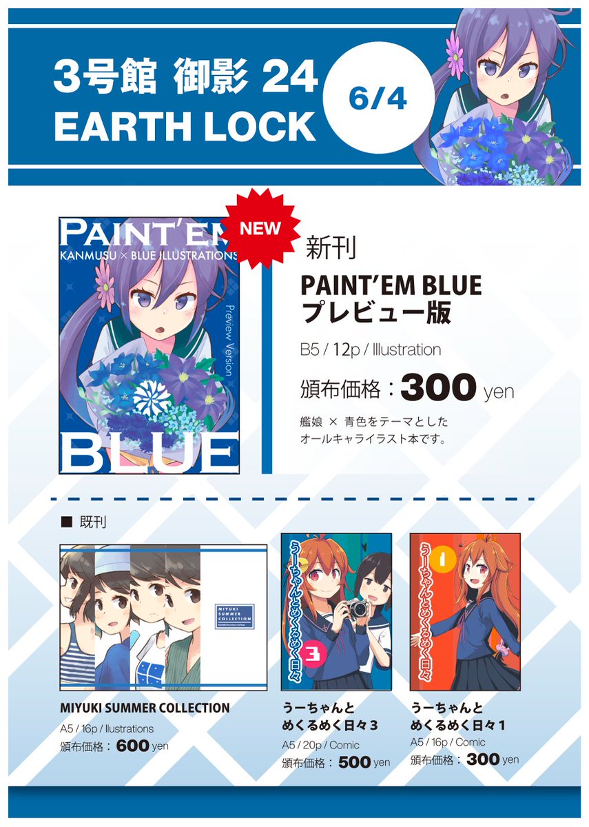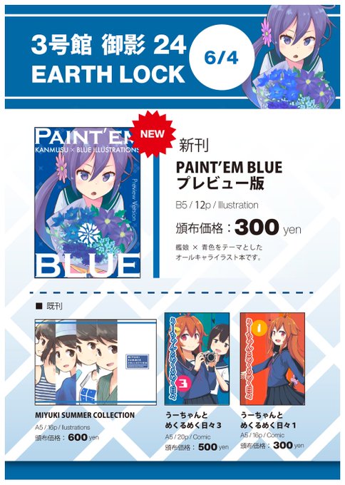 【C102お品書き】8/12 (2日目・土)東3オ-28a「地球ロック」 新刊セット『Paint'em BLUE』B5/24ページ/フルカラー/800円 ほか既刊4種、委託1種を頒布します。会場限定の曙ちゃんB5紙袋はぜひ戦利品の持ち運びに活用してください twitter.com/toge9683/statu…