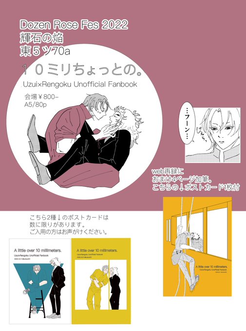 2 18 12/11 🌹輝石の焔 現パロ宇煉「10ミリちょっとの。」頒布のお知らせです。 web再録に帰国後再会した2人のお話を4p追加。 ポストカード1枚つきです。 よろしくお願いします☺️ ※🐯にて事後通領予定です。 ※事後通領分にもオレンジのポストカードが1枚つきます 22/12/04 20:10