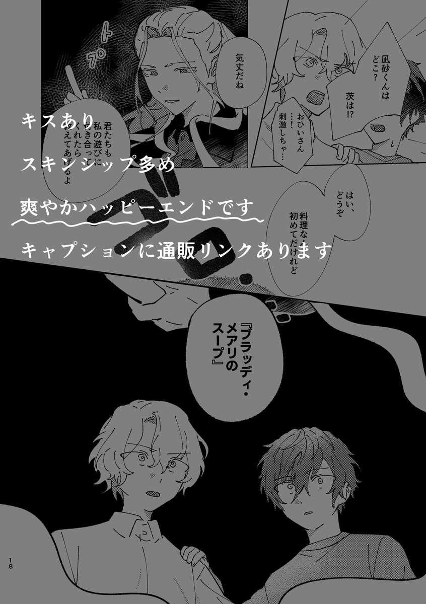 109 626 【8/20大阪ブリデ新刊サンプル①】(1/3) 「おいしいメアリのスープ」 A5/44p/¥500 SS決勝後if、Edenを乗っ取ろうとする神父にEveが抗おうとする話です。 ※※犬の残酷な死、嘔吐、暴力※※ ※※キスあり※※ 23/07/13 17:50