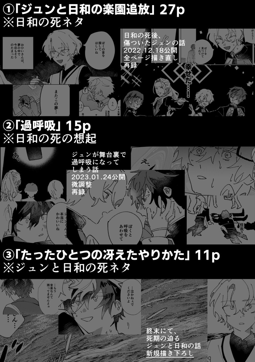 【⚠️死ネタ】再掲 「ジュンと日和の楽園追放」27p 日和の死後、傷ついたジュンの話です。 (1/8) ・日和が死んでます ・ジュンがアイドル業界から失踪 ・残酷な行為の示唆 ・登場人物を取り巻く環境の悪化 ・ツリーの最後に同人誌の案内があります