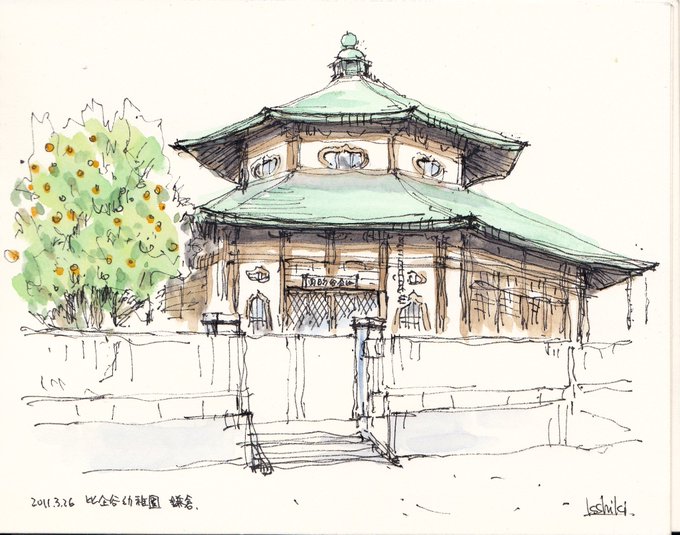7 96 ペン水彩画スケッチ 鎌倉の風景 「比企ヶ谷幼稚園」F0 20110326 妙本寺境内にある夢殿を模した建物。 1937年 完成 木造2階建て 2011年のスケッチ。 #水彩画 #ペン水彩画 #透明水彩 #鎌倉 #妙本寺 #比企ヶ谷幼稚園 23/08/19 06:51