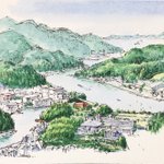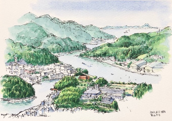 6 129 ペンスケッチ 相生の風景 「相生・宮山から」SM 20230811 相生市宮山からのスケッチ。 着彩しました😊🎵 #水彩画 #ペン水彩画 #透明水彩 #相生市 #宮山 #大島山 #相生湾 23/08/12 10:19