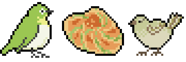 今日は左からメジロ、うぐいすパン、うぐいすでお茶を濁させてください!作ろうと思ってもあんこすら売ってないうぐいすパン #ドット絵 #pixelart