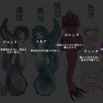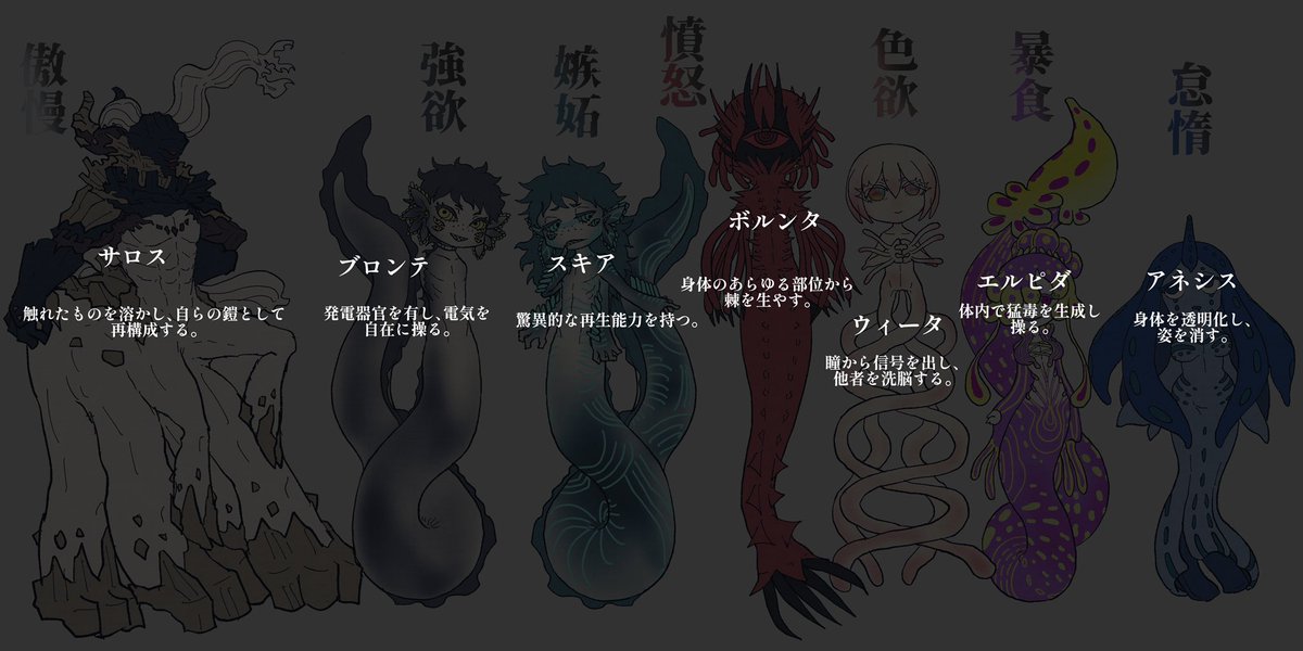 #とかげの月 月での遺伝子実験にて生み出された肉の者7兄弟です🐙 7つの大罪モチーフ!各人の詳細はまたいずれ