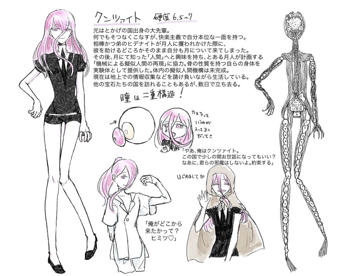 #創作宝石 #とかげの月 クンツァイトの紹介です🌙 まとめ(1枚目)と過去絵抜粋。 改めてこう、ろくでもねえなあという感じですね(好き)