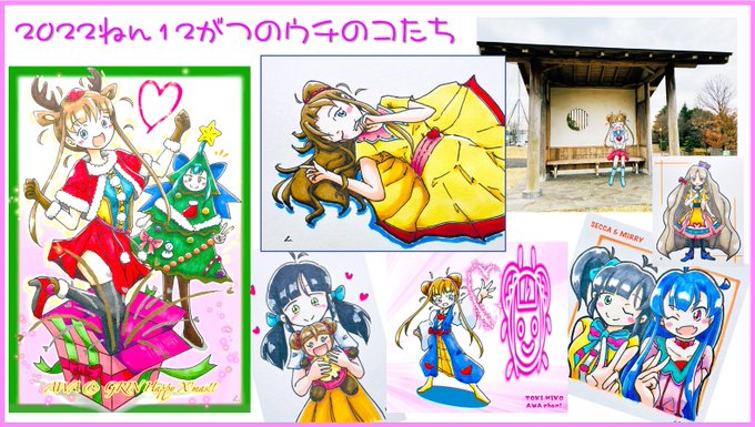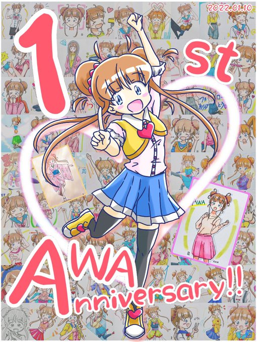 #自分の代表作だと思う絵を一枚だけ選んでみよう なかなか難しいのですが、思い入れも含めてアワァちゃん誕生1周年記念のイラストが一番かもしれません☺️💕 1年分の絵を背景に、不慣れなデジタルで可愛く元気に描けたと今でも満足しています✨