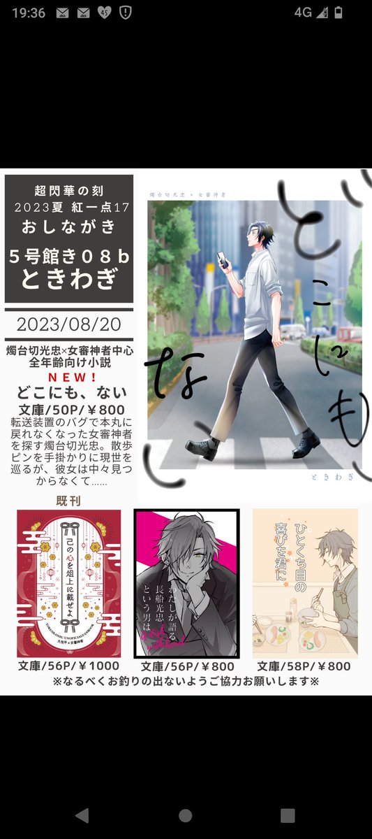 【5/4超閃華】ときわぎ:おしながき 新刊は燭さに(女審神者)現パロ本、既刊も燭さに。全て薄い全年齢向け小説本です。このサークルでは燭さにの本しかありません。 当日は本人不在で、代理がスペースにおります。12時前後に撤収を予定しています。 pixiv.net/artworks/97991…