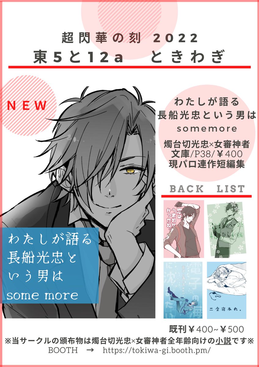 5/4超閃華の刻2022のおしながき再掲です。 東5と12a:ときわぎ 取り扱いは全て燭台切光忠×女審神者の小説です(燭さにしかない)。新刊は現パロです。 ※開始直後不在の時間が出ます。また代理にスペースを任せているため、12時前後に撤収予定です。 持ち込み本はツリーへ。 pixiv.net/artworks/97991…