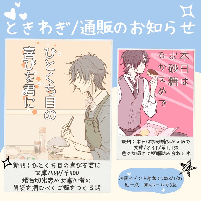 【通販のお知らせ】 燭台切光忠×女審神者の小説本を通販しています。 新刊はみっちゃんとおうちご飯の本。既刊は色んな本丸の燭さに短編×5本詰め合わせ本です(在庫僅少)。 1月末のイベントにも持ち込み予定です。 BOOTH(自家通販) tokiwa-gi.booth.pm/items/4056220 pixiv.net/artworks/10405…