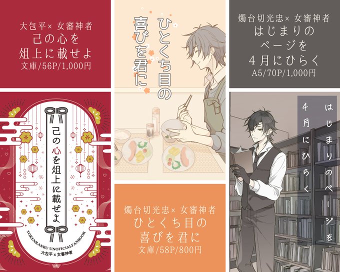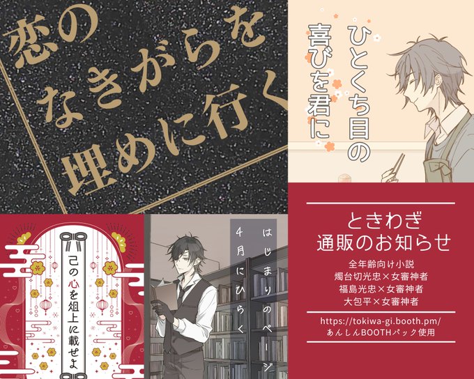 【ときわぎ:通販のお知らせ】 燭台切光忠×女審神者。全年齢向け小説本。あんしんBOOTHパック使用。 C99新刊『はじまりのページを4月にひらく(前編)』の他に、既刊二種があります。 tokiwa-gi.booth.pm pixiv.net/artworks/95143… #燭さに #燭台切光忠 #女審神者
