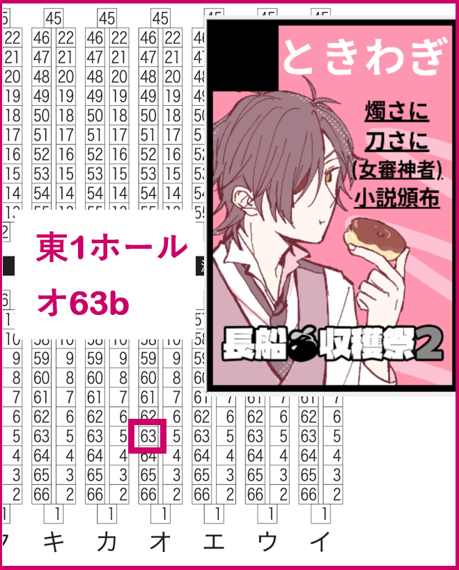 東2 サ22bときわぎの、明日のおしながき、再掲です。 燭さに小説オンリー、すべての頒布物には燭さにしかないサークル。 目印は机上の新刊と同じ絵柄のA4サイズのピンクなみっちゃんの立看です。 pixiv.net/artworks/96999…