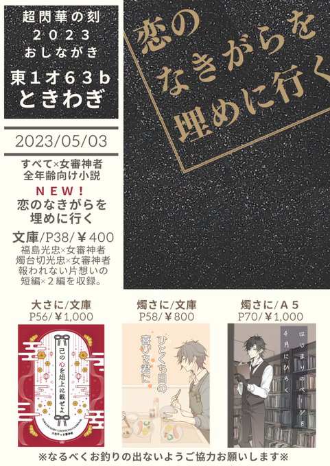【5/4超閃華】おしながき 新刊は #長船収穫祭2 に合わせた、燭さに・福さにの片想いの本。既刊は燭さにメイン、大さにの既刊も持ち込みします。 pixiv.net/artworks/10741…