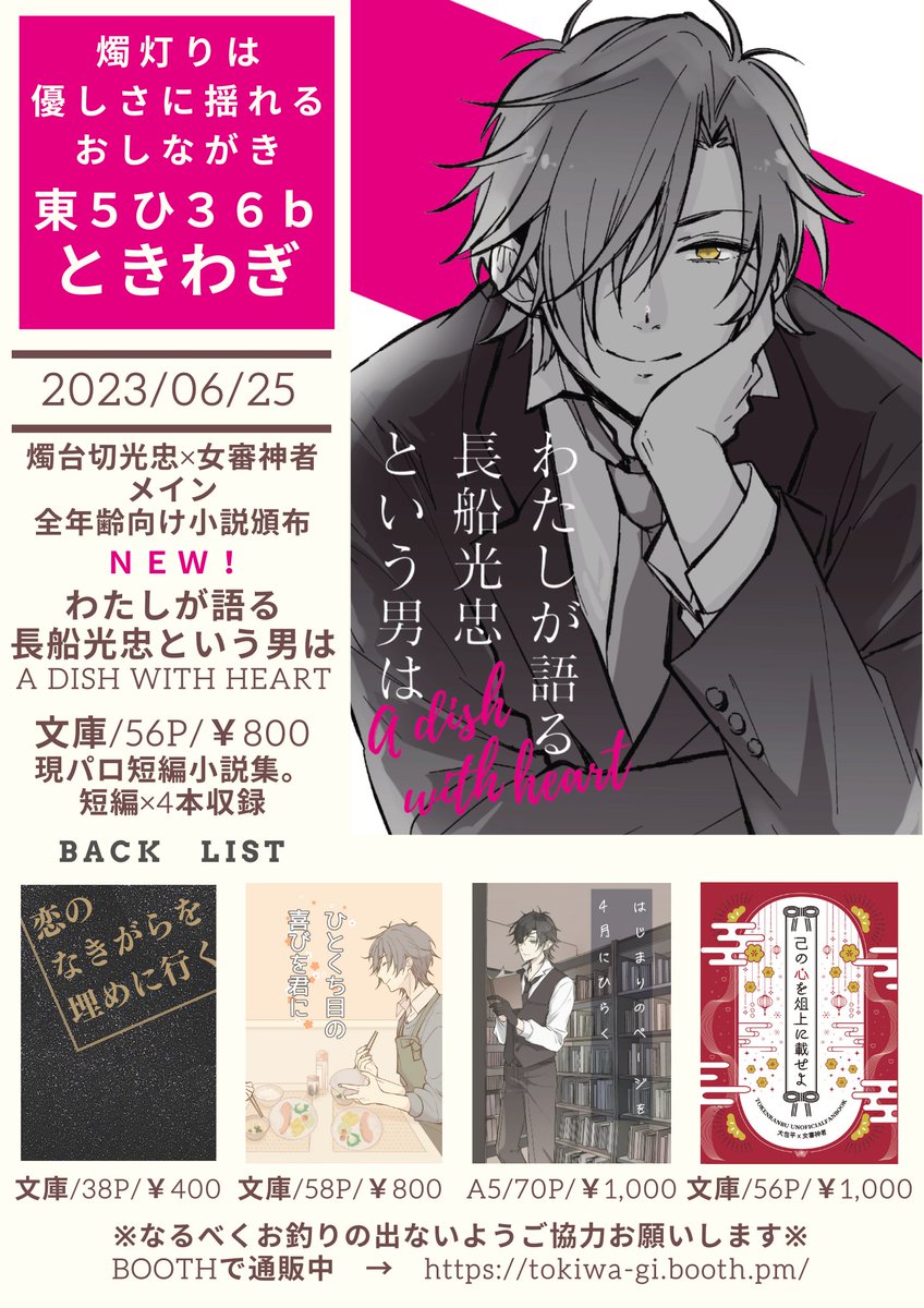 【6/25ジュンブラ燭灯り】おしながき 東5ホール ひ36b:ときわぎの頒布物一覧です。 燭台切光忠×女審神者の小説メインに頒布します。 燭さに以外に、福さに、大さに本も持って行きます。当日は13時くらいには撤収予定です。お時間の合う方遊びに来てください! pixiv.net/artworks/10919…