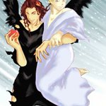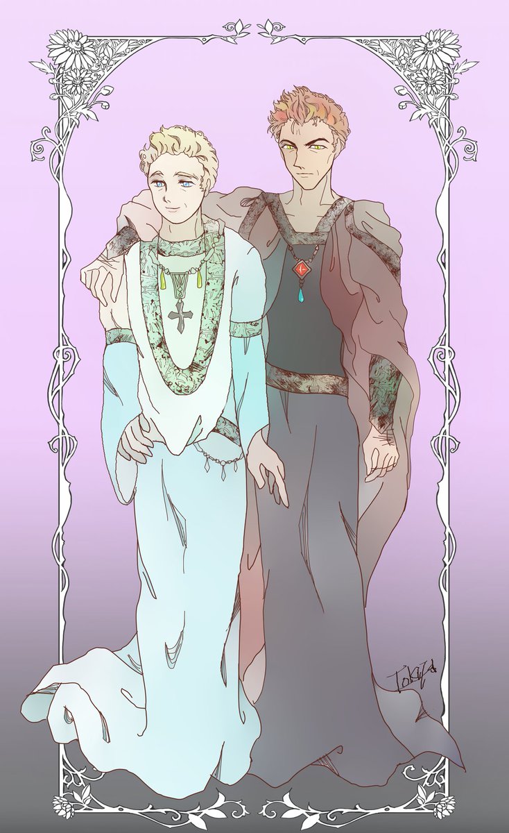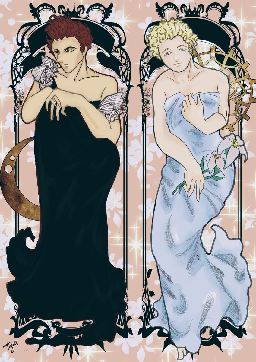 #GoodOmensFanArt #GoodOmens ミュシャ風を目指したんだ……短髪クロは向かないからフリル付けてやった(腹癒せ)