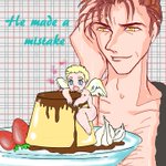 sawさん(@nununu1080 )のお羽ちゃん僕も描かせて頂きました。なんか構図が某ミドリさんに似ちゃったな…お羽ちゃんをお風呂に入れて泣かれたクロウリーは、機嫌を取ろうとして大失敗しました😌(プリンまみれ