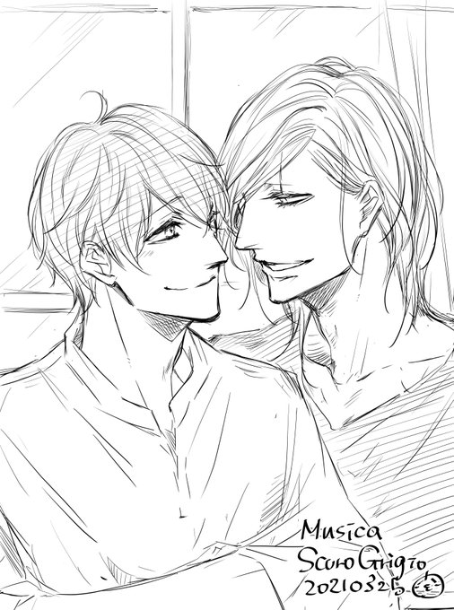 最近イラスト系が少ないし、初見さんもいらっしゃるかも?という事で再アップ😊 αΩの蓮と悠も加えたバージョンもどこかのタイミングで描くぞ〜! #鈍色ムジカ #三日月骨董品店の看板猫 #だからいいって言ってくれ
