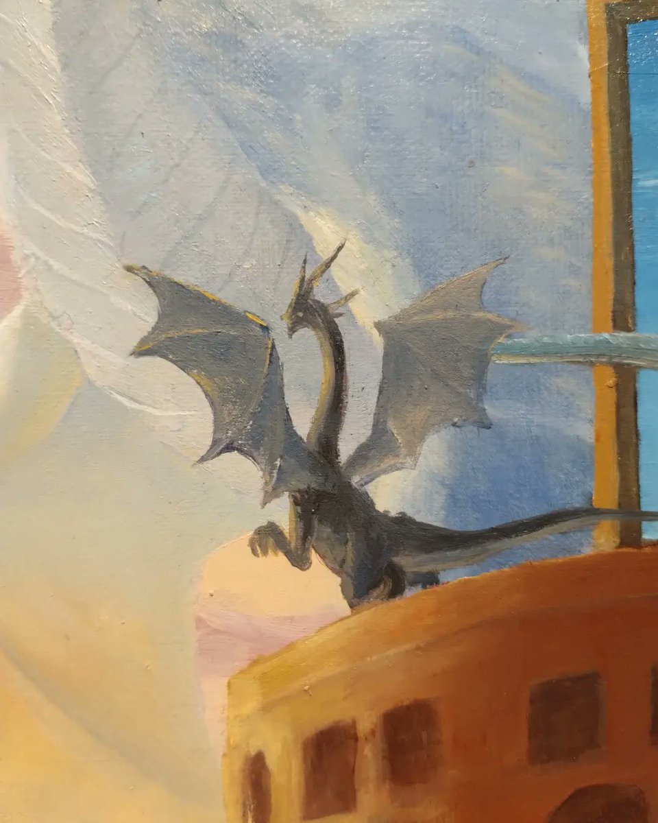 『愚昧、なれど善い旅だったと』 F4号(333×242㎜) 「竜の夢想はここまで。相変わらず竜は愚鈍であったけど、得たものはあった。夢想は過去に消える。それでも善い旅だったと心から。 そして、どうか善い旅を送りますように。」 #油絵 #oilpainting #イラスト #絵描きさんと繋がりたい #art #アート