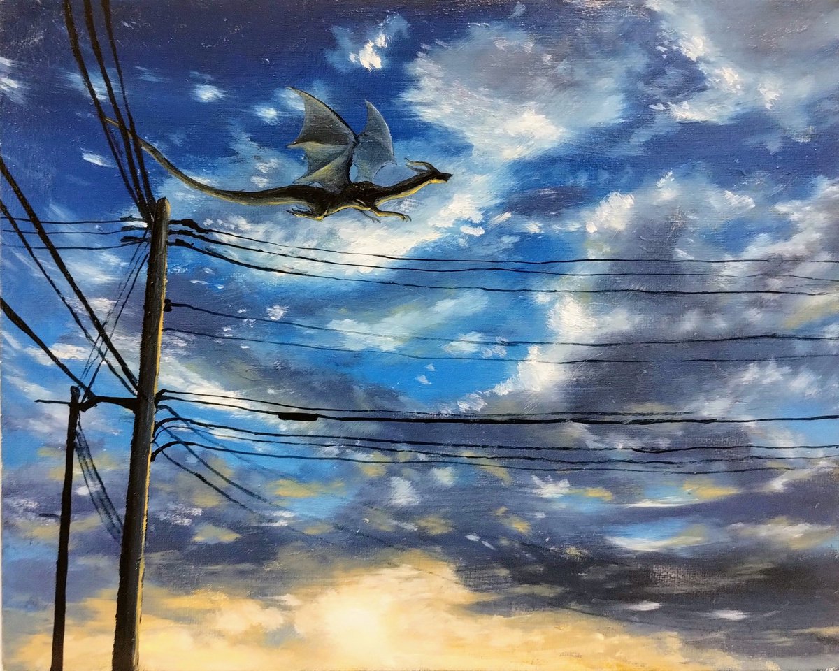 『竜と電柱、空』 F3号(273×220㎜) キャンバスにアクリル・油彩 こんなにもきれいな空なのだから、竜がいてもおかしくないでしょう? #油絵 #oilpainting #イラスト #ファンタジーアート #絵描きさんと繋がりたい #art #ilustlation